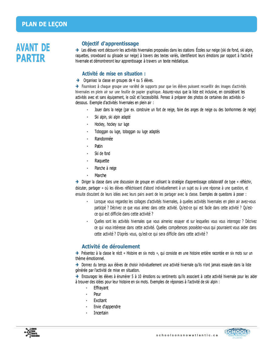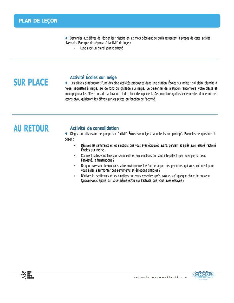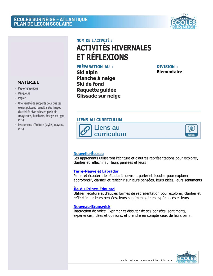 Amusez-vous avec nous! Les sorties scolaires offrent non seulement de précieuses opportunités d’apprentissage, mais répondent également aux attentes du curriculum scolaire. Les enseignant(e)s du Canada atlantique ont élaboré des plans de leçons qui relient les activités en station de ski aux attentes en matière de curriculum et d’initiatives éducatives de la province.