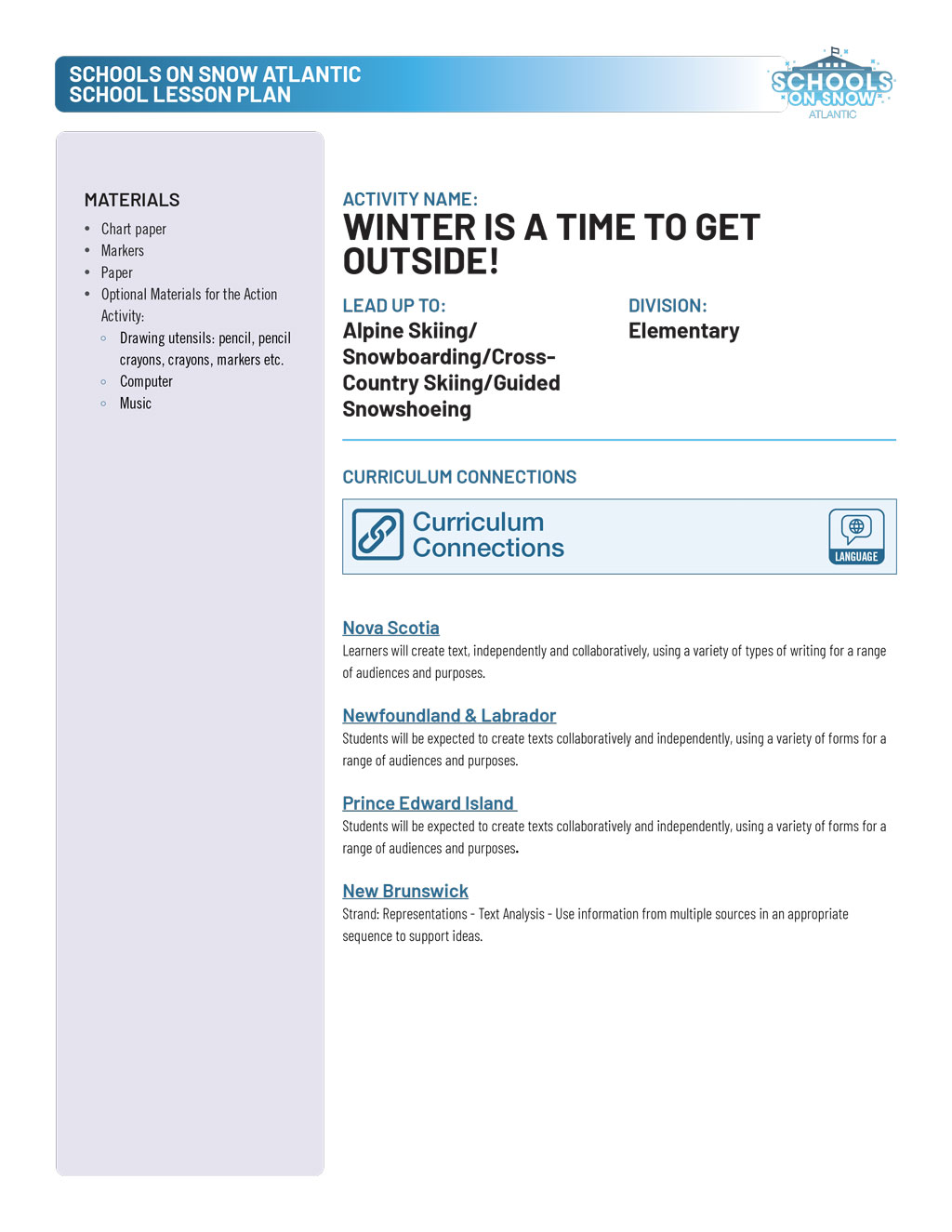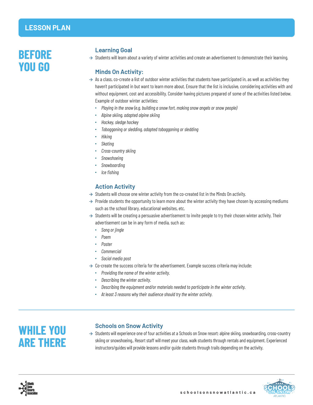 Schools on Snow – Atlantic is an initiative led by the Atlantic Canada Snow Resort Association (ASRA) in collaboration with the Canadian Ski Council. Our aim is to promote and facilitate snow resort activities for all students, ensuring equal access for everyone. We provide Atlantic Canada curriculum-aligned lesson plans, as well as resources and strategies to support educators and students on school trips. Our goal is to remove barriers to access and make winter sports education more inclusive.